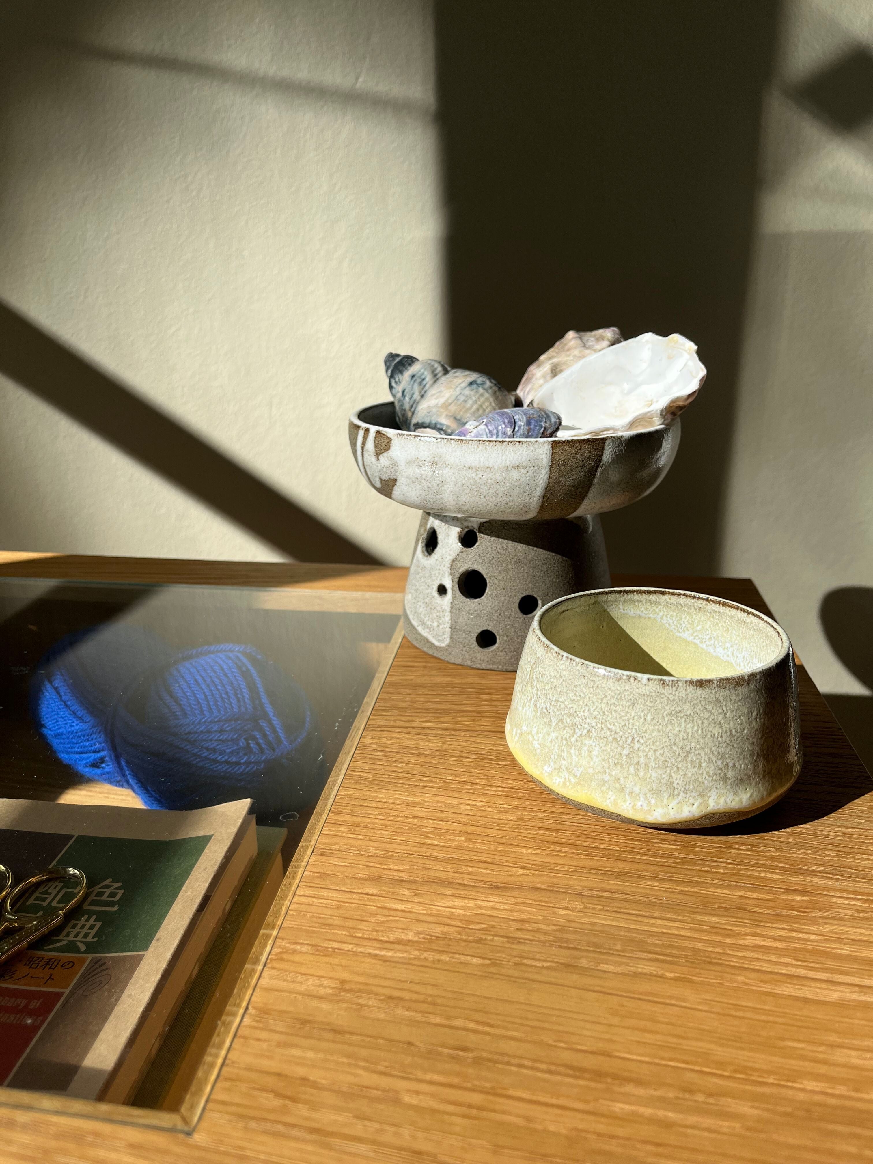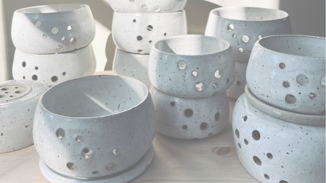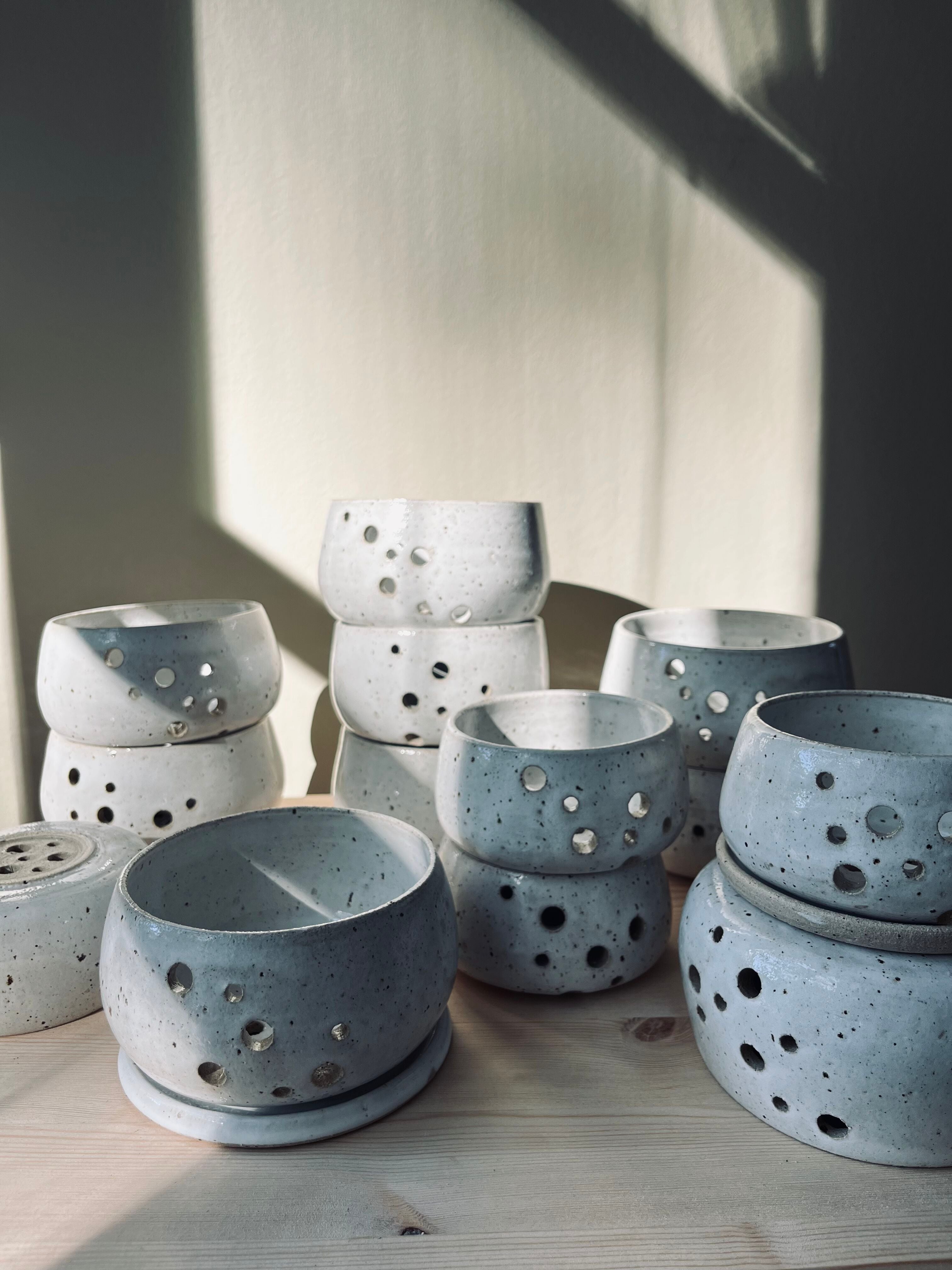 Hvert stykke hånddrejes i mit værksted midt i naturen på Djursland, hvor skov, hav og årstidernes skiften giver inspiration til form, farve og udtryk.
